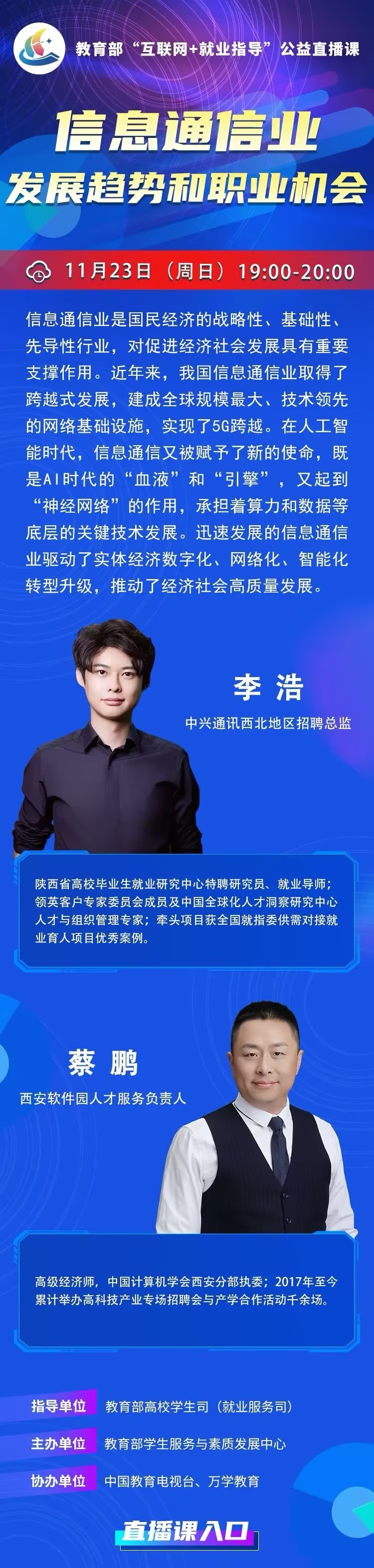 请各学院积极宣传和推送,可组织全体毕业生和在校生观看,以了解信息通信业发展趋势和职业机会,有针对性和目标性的规划自己的职业发展方向和职业选择!提升自己的岗位适配能力!实现顺利就业。具体介绍和直播入口如下。各学院主管学生副院长收到请回复。